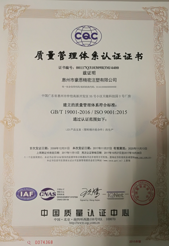In September 2017, passed the ISO9001:2015 quality system certification.